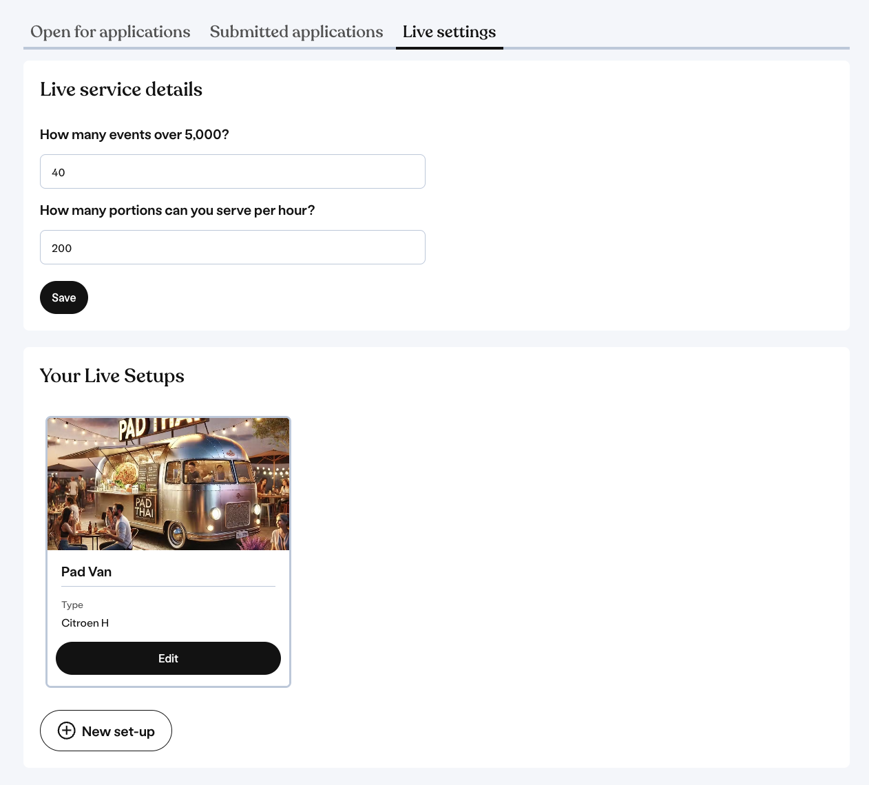 Navigate to the 'Live' tab on your supplier dashboard. Under 'Live settings' you can give some details around your previous experience and service capacity. Under this you will see 'Your Live Setups' where you can create and view the different types of service units you use.