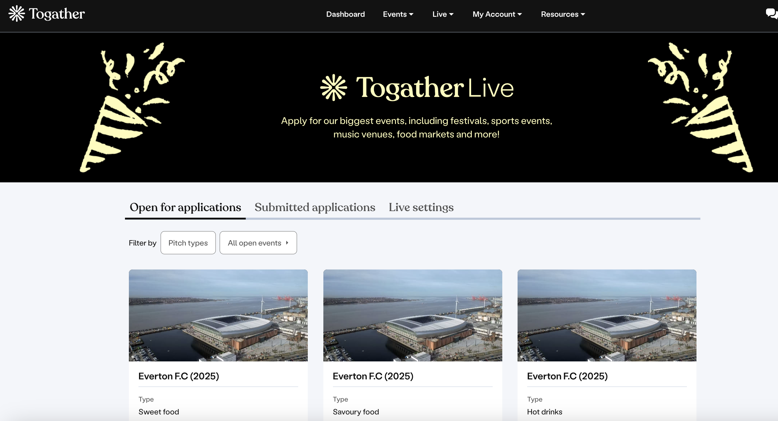 You can find and apply for open live events via TogatherLive. For approved suppliers only, this can be found under the 'Live' tab -> 'Open for applications'.