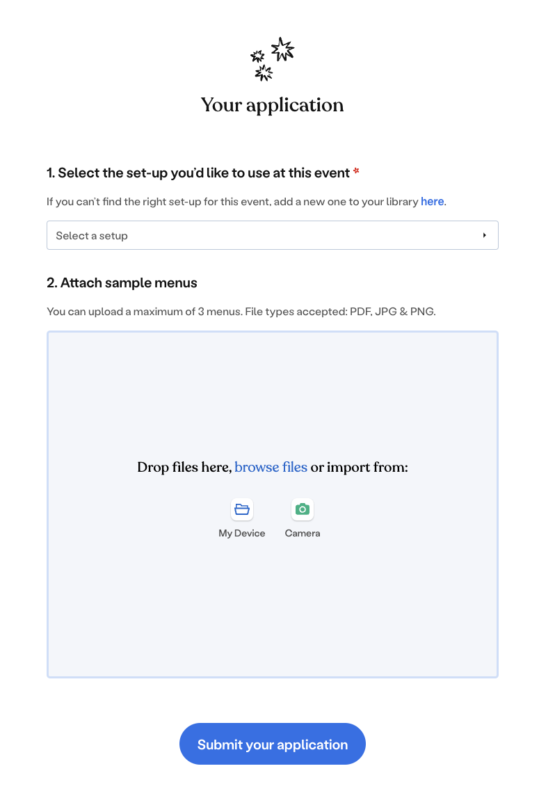 View a pitch group for a full brief on the event, commercials and what supplier we are looking for. If you think you are a good fit, click 'apply for this event' to tell us which setup you think it most suitable. You will also need to attach a sample menu to show a typical offering (prices do not need to be correct.)